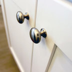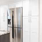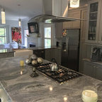 Geschlossene, Mittelgroße Klassische Küche in L-Form mit Unterbauwaschbecken, Schrankfronten mit vertiefter Füllung, grauen Schränken, Granit-Arbeitsplatte, Küchenrückwand in Beige, Rückwand aus Porzellanfliesen, Küchengeräten aus Edelstahl, Keramikboden und grauem Boden in St. Louis — Houzz