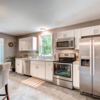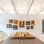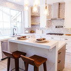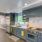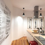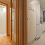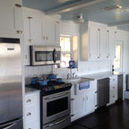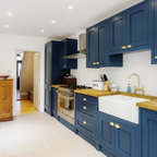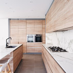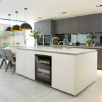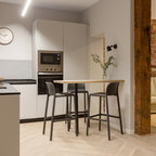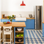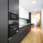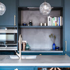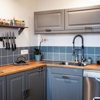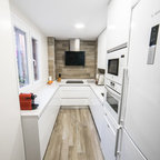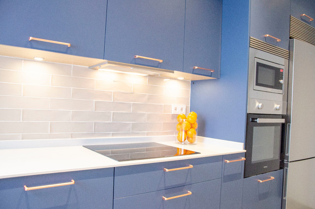 Geschlossene, Einzeilige, Mittelgroße Küche mit blauen Schränken, Quarzwerkstein-Arbeitsplatte und weißer Arbeitsplatte in Madrid — Houzz