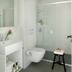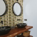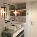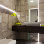 Modernes Badezimmer mit Eckdusche, Aufsatzwaschbecken, Waschtisch aus Holz, flächenbündigen Schrankfronten, dunklen Holzschränken, beigefarbenen Fliesen, beiger Wandfarbe, beigem Boden und Schiebetür-Duschabtrennung in Malaga — Houzz