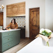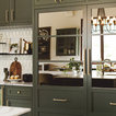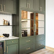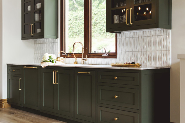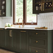 colors, dark green shaker cabs, white tile (and pattern), gold hardware, wood accents, lots of white