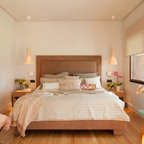 Se trata de un dormitorio de tamaño longitudinal donde se ha situado la zona de noche en un lado y el vestidor en el otro; cada área con entrada de luz natural. “Buscamos elementos que aportaran calidez como la madera. También destacan los textiles: queríamos que envolvieran el conjunto dándole un toque romántico”