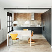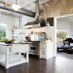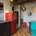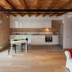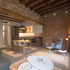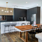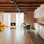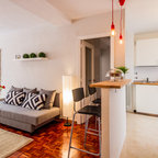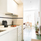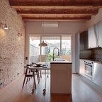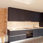 Geschlossene, Mittelgroße Eklektische Küche ohne Insel in L-Form mit Unterbauwaschbecken, flächenbündigen Schrankfronten, schwarzen Schränken, hellem Holzboden, Küchengeräten aus Edelstahl und Küchenrückwand in Braun in Barcelona — Houzz