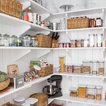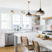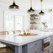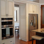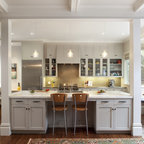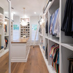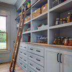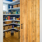 Mittelgroße Klassische Küche mit Vorratsschrank, offenen Schränken, weißen Schränken, hellem Holzboden, Landhausspüle, Marmor-Arbeitsplatte, Küchengeräten aus Edelstahl und Kücheninsel in Boston — Houzz