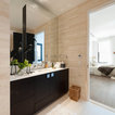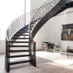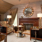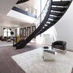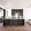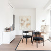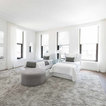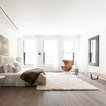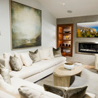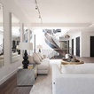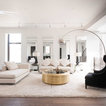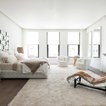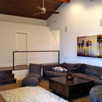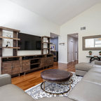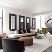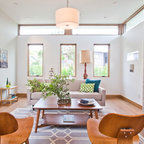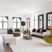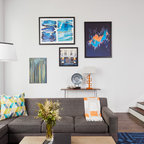 Offenes Modernes Wohnzimmer mit weißer Wandfarbe und dunklem Holzboden in New York — Houzz