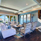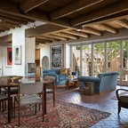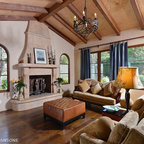 Geräumiges Mediterranes Wohnzimmer mit weißer Wandfarbe, braunem Holzboden, Kamin, gefliester Kaminumrandung und braunem Boden in Los Angeles — Houzz