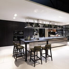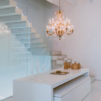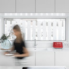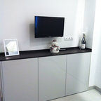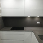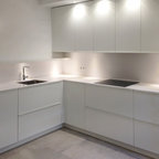 Geschlossene, Mittelgroße Moderne Küche in L-Form mit flächenbündigen Schrankfronten, weißen Schränken, Küchenrückwand in Weiß, Küchengeräten aus Edelstahl und braunem Holzboden in Madrid — Houzz