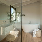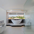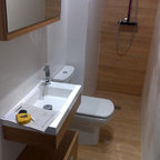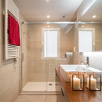 Modernes Badezimmer mit offenen Schränken, weißen Fliesen, Keramikfliesen, weißer Wandfarbe, integriertem Waschbecken und weißer Waschtischplatte in Barcelona — Houzz