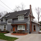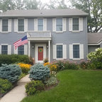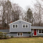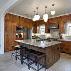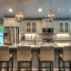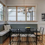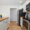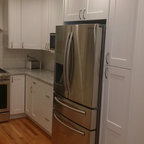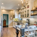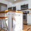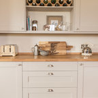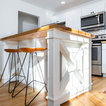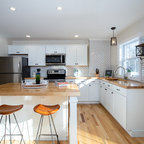 Mittelgroße Country Wohnküche in L-Form mit Unterbauwaschbecken, Schrankfronten im Shaker-Stil, weißen Schränken, Arbeitsplatte aus Holz, Küchenrückwand in Weiß, Rückwand aus Metrofliesen, Küchengeräten aus Edelstahl, braunem Holzboden, Kücheninsel, beigem Boden und brauner Arbeitsplatte in New York — Houzz