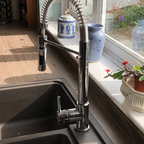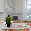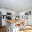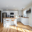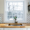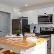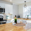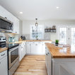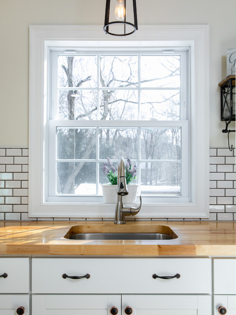Bright farmhouse kitchen filled with tons of natural light featuring white cabinets with butcher clock countertops, and oil rubbed bronze handles.