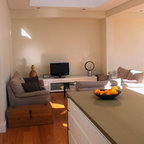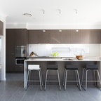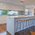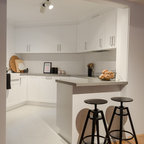 This works quite well with the light colours and a simple darker tone splash back and dark grey stools. Small amount of timber detail noted. Too much white?