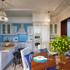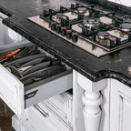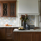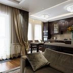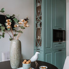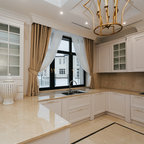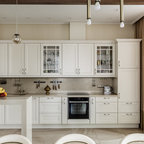 Klassische Küche in L-Form mit Landhausspüle, Schrankfronten mit vertiefter Füllung, weißen Schränken und Küchenrückwand in Grau in Moskau — Houzz