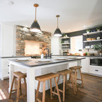 This modern farmhouse kitchen was created to match the style and feel of the rest of the historic house built in the 1700s. Reclaimed flooring and counters, white fully custom Grabill cabinets, a farmhouse sink, and marble counters complete this lovely kitchen. Design and Installation by Main Street at Botellos. Photography by Eric Roth.