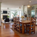 Große Landhaus Wohnküche in L-Form mit Landhausspüle, Schrankfronten mit vertiefter Füllung, weißen Schränken, Marmor-Arbeitsplatte, Küchenrückwand in Weiß, Rückwand aus Keramikfliesen, Küchengeräten aus Edelstahl, braunem Holzboden und Kücheninsel in Boston — Houzz