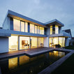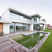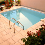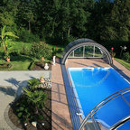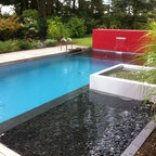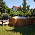 Moderner Pool hinter dem Haus in rechteckiger Form mit Dielen in Sonstige — Houzz