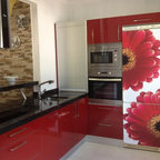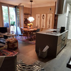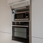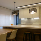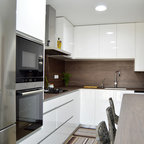 Offene, Große Moderne Küche in U-Form mit Unterbauwaschbecken, flächenbündigen Schrankfronten, weißen Schränken, Speckstein-Arbeitsplatte, Küchenrückwand in Grau, Küchengeräten aus Edelstahl, hellem Holzboden und beigem Boden in Barcelona — Houzz