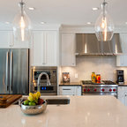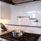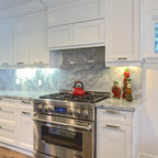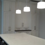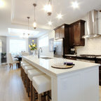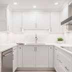 Einzeilige, Mittelgroße Klassische Wohnküche mit Doppelwaschbecken, Schrankfronten im Shaker-Stil, weißen Schränken, Mineralwerkstoff-Arbeitsplatte, weißen Elektrogeräten, Porzellan-Bodenfliesen und grauem Boden in Calgary — Houzz