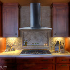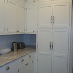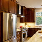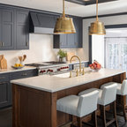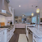 Offene, Zweizeilige, Mittelgroße Klassische Küche mit Unterbauwaschbecken, Schrankfronten im Shaker-Stil, Quarzwerkstein-Arbeitsplatte, Küchenrückwand in Weiß, Rückwand aus Metrofliesen, Küchengeräten aus Edelstahl, hellem Holzboden, grauem Boden und weißer Arbeitsplatte in Indianapolis — Houzz
