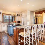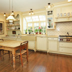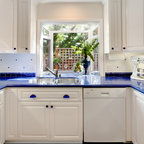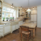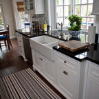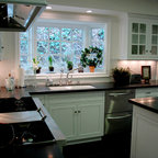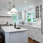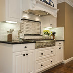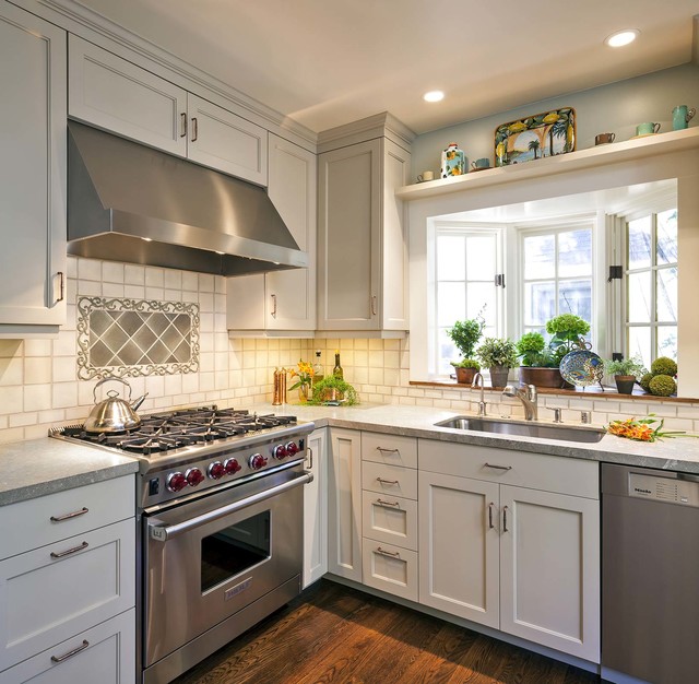 Klassische Küche in L-Form mit Unterbauwaschbecken, Schrankfronten im Shaker-Stil, weißen Schränken, Küchenrückwand in Weiß, Küchengeräten aus Edelstahl und dunklem Holzboden in San Francisco — Houzz