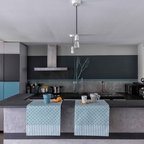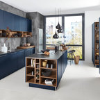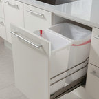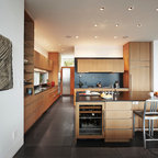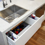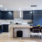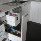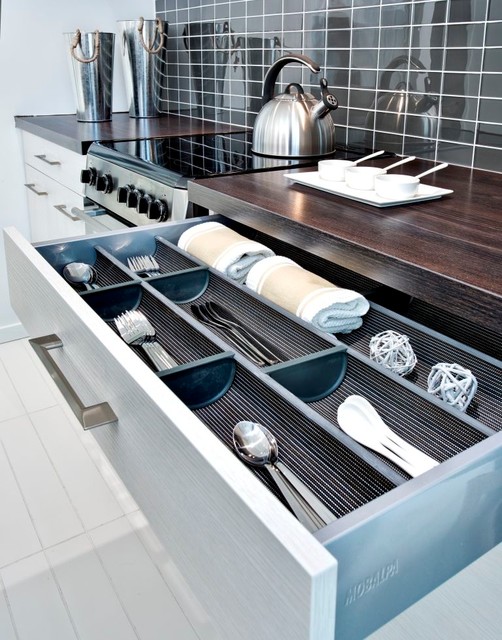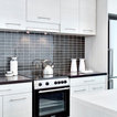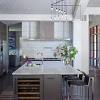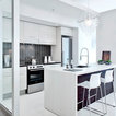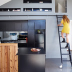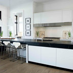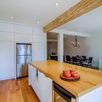 Offene, Einzeilige, Kleine Moderne Küche mit flächenbündigen Schrankfronten, weißen Schränken, Küchenrückwand in Grau, Rückwand aus Keramikfliesen, Küchengeräten aus Edelstahl, Halbinsel und Waschbecken in Montreal — Houzz
