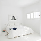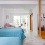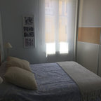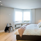 Großes Modernes Schlafzimmer ohne Kamin mit grauer Wandfarbe, braunem Holzboden und braunem Boden in Sonstige — Houzz