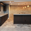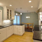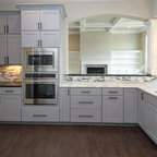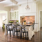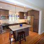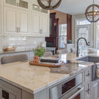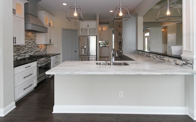 Mittelgroße Klassische Wohnküche in U-Form mit Doppelwaschbecken, Schrankfronten im Shaker-Stil, weißen Schränken, Marmor-Arbeitsplatte, bunter Rückwand, Rückwand aus Stäbchenfliesen, Küchengeräten aus Edelstahl und dunklem Holzboden in Indianapolis — Houzz