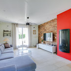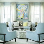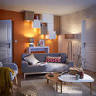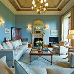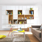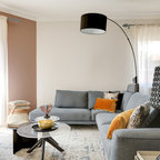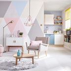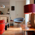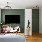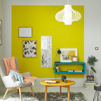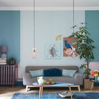 Mittelgroßes, Fernseherloses, Offenes Modernes Wohnzimmer mit blauer Wandfarbe und hellem Holzboden in Lille — Houzz