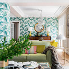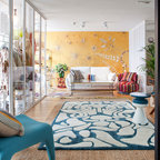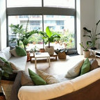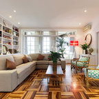 Großes, Repräsentatives, Abgetrenntes Tropenstil Wohnzimmer ohne Kamin mit weißer Wandfarbe, Teppichboden und Multimediawand in Barcelona — Houzz