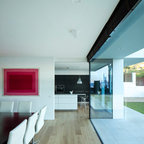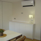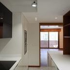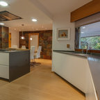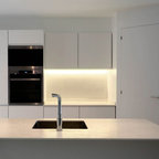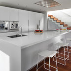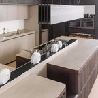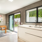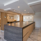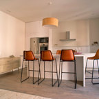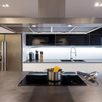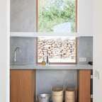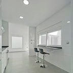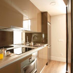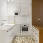 Offene, Einzeilige, Mittelgroße Moderne Küche mit flächenbündigen Schrankfronten, hellbraunen Holzschränken und Kücheninsel in Barcelona — Houzz