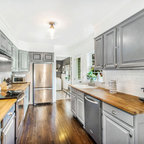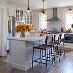 Mittelgroße Landhaus Wohnküche in L-Form mit Landhausspüle, Schrankfronten im Shaker-Stil, blauen Schränken, Quarzwerkstein-Arbeitsplatte, Rückwand aus Mosaikfliesen, Küchengeräten aus Edelstahl und braunem Holzboden in San Francisco — Houzz