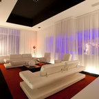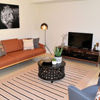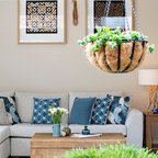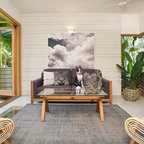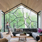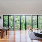 JG King Homesによる、コンテンポラリースタイルのリビング。モノトーンと木の素材感や、観葉植物との組み合わせのバランスが絶妙。オーストラリアの事例です。