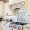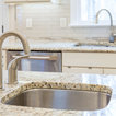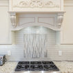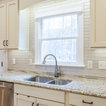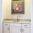 The Giallo Ornamental Premium Granite countertops, and May Casual Flirt Gloss Glass tile in 2 x 8 backsplash go very well with the Norcraft cabinets in Antique White with the Chocolate Glaze. The Cordova Pulls from the Jeffrey Alexander collection pop against the countertops!