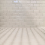 Mittelgroßes Klassisches Badezimmer En Suite mit Schrankfronten mit vertiefter Füllung, weißen Schränken, bodengleicher Dusche, Wandtoilette mit Spülkasten, weißen Fliesen, Metrofliesen, weißer Wandfarbe, Marmorboden, Unterbauwaschbecken, Marmor-Waschbecken/Waschtisch, weißem Boden, Falttür-Duschabtrennung und weißer Waschtischplatte in Chicago — Houzz
