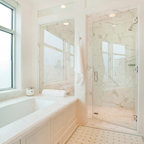 Mittelgroßes Klassisches Badezimmer En Suite mit Schrankfronten mit vertiefter Füllung, weißen Schränken, bodengleicher Dusche, Wandtoilette mit Spülkasten, weißen Fliesen, Metrofliesen, weißer Wandfarbe, Marmorboden, Unterbauwaschbecken, Marmor-Waschbecken/Waschtisch, weißem Boden, Falttür-Duschabtrennung und weißer Waschtischplatte in Chicago — Houzz