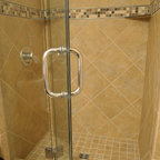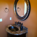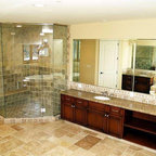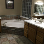 We utilized a Moroccan inspired mirror to accentuate and play with the unusual slanted roof line. By adding clean lines and ample drawers for storage, we were able to transform this outdated bathroom into a true modern master retreat.