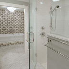 Mittelgroßes Klassisches Badezimmer En Suite mit Schrankfronten mit vertiefter Füllung, weißen Schränken, bodengleicher Dusche, Wandtoilette mit Spülkasten, weißen Fliesen, Metrofliesen, weißer Wandfarbe, Marmorboden, Unterbauwaschbecken, Marmor-Waschbecken/Waschtisch, weißem Boden, Falttür-Duschabtrennung und weißer Waschtischplatte in Chicago —  Houzz
