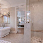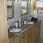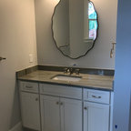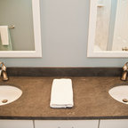 We utilized a Moroccan inspired mirror to accentuate and play with the unusual slanted roof line. By adding clean lines and ample drawers for storage, we were able to transform this outdated bathroom into a true modern master retreat.