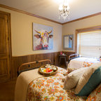 Interesting placement of bed against windows in attic bedroom, with closet wall opposite.