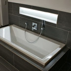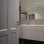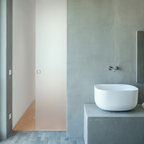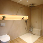 Kleines Modernes Duschbad mit blauen Schränken, offener Dusche, weißen Fliesen, grauer Wandfarbe, Marmorboden und grauem Boden in Berlin — Houzz