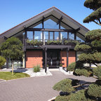 4. Asiatisch angehauchter Vorgarten mit Kieselbett und Bonsais. Deutschland