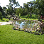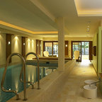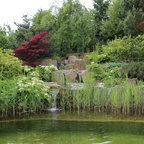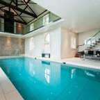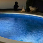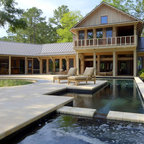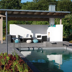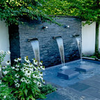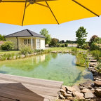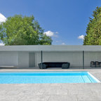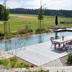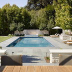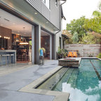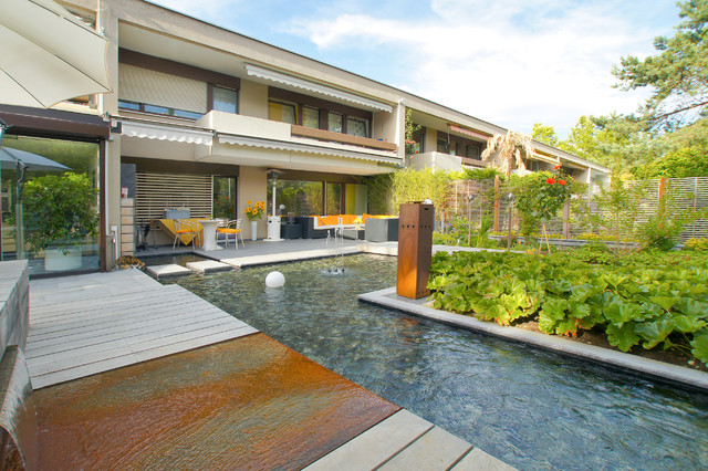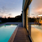 Mittelgroßer Moderner Pool hinter dem Haus in L-Form mit Dielen und Wasserspiel in Sonstige — Houzz