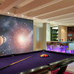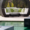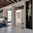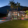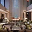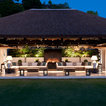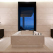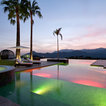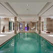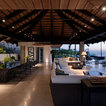 While there’s plenty to take in and admire, the deliberately open-plan layout ensures that the eye is drawn through to a spectacular chandelier in the adjacent living space, and then through wide expanses of glass beyond, which open out to gardens complete with an infinity pool and stunning views.