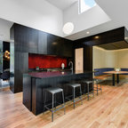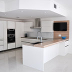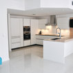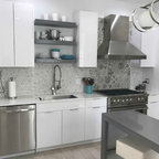Kleine Moderne Wohnküche ohne Insel in U-Form mit Doppelwaschbecken, flächenbündigen Schrankfronten, weißen Schränken, Quarzit-Arbeitsplatte, Küchenrückwand in Weiß, Glasrückwand, Küchengeräten aus Edelstahl und Keramikboden in Portland Maine — Houzz