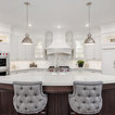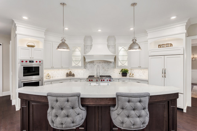 The luxury by NEW CARRARA! Elegant custom kitchen island and countertops featuring slight and soft greyish tones, a sophisticated pattern to enhance your space.