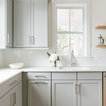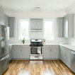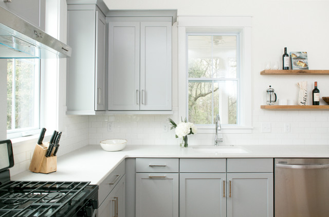 Geschlossene, Mittelgroße Klassische Küche ohne Insel in U-Form mit Waschbecken, Schrankfronten im Shaker-Stil, grauen Schränken, Quarzit-Arbeitsplatte, Küchenrückwand in Weiß, Rückwand aus Metrofliesen, braunem Holzboden und beigem Boden in Charleston — Houzz