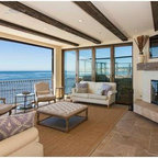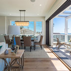 Maritimes Wohnzimmer mit grauer Wandfarbe, braunem Holzboden und braunem Boden in Providence — Houzz
