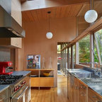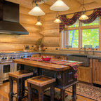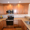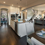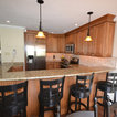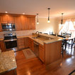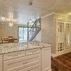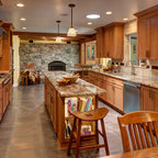 Fantastic kitchen remodel maximizing space and efficiency! Lovely warm light in eating area and kitchen. Kabinart cabinetry in Cherry wood species, stain color, Honeywood. Granite was selected as New Venetian Gold with back splash and bar top.