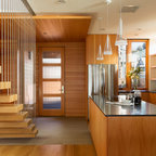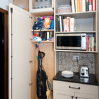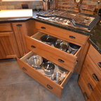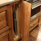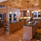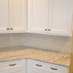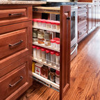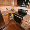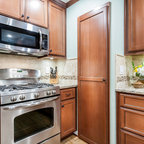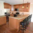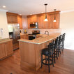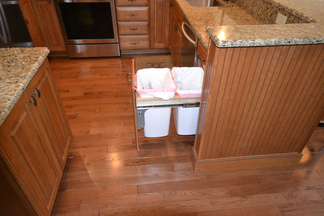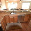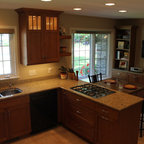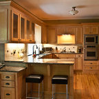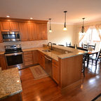 Fantastic kitchen remodel maximizing space and efficiency! Lovely warm light in eating area and kitchen. Kabinart cabinetry in Cherry wood species, stain color,Honeywood. Granite was selected as New Venetian Gold with backsplash and bar top.