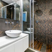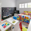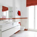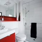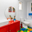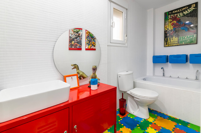 Modernes Kinderbad mit verzierten Schränken, roten Schränken, Badewanne in Nische, Wandtoilette mit Spülkasten, weißen Fliesen, weißer Wandfarbe, Aufsatzwaschbecken, buntem Boden und roter Waschtischplatte in Sonstige — Houzz