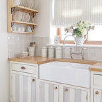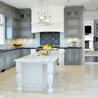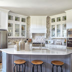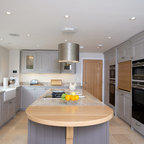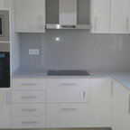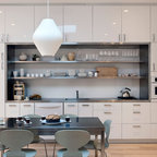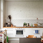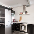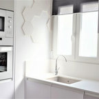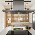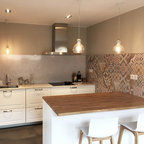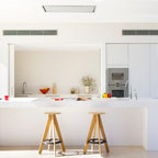 Große Nordische Wohnküche in U-Form mit flächenbündigen Schrankfronten, weißen Schränken, Küchenrückwand in Weiß, Küchengeräten aus Edelstahl, Betonboden und zwei Kücheninseln in Barcelona — Houzz