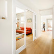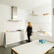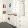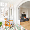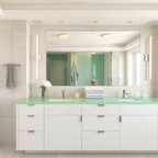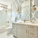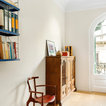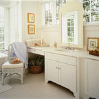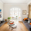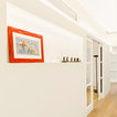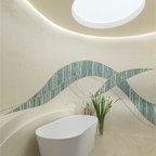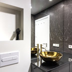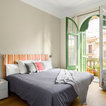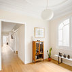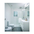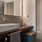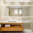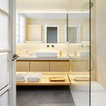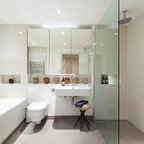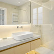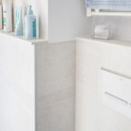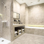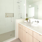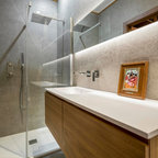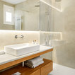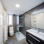 Modernes Duschbad mit hellbraunen Holzschränken, offener Dusche, beigefarbenen Fliesen, Porzellanfliesen, beiger Wandfarbe, Porzellan-Bodenfliesen, grauem Boden, offener Dusche, weißer Waschtischplatte, flächenbündigen Schrankfronten und Aufsatzwaschbecken in Barcelona — Houzz